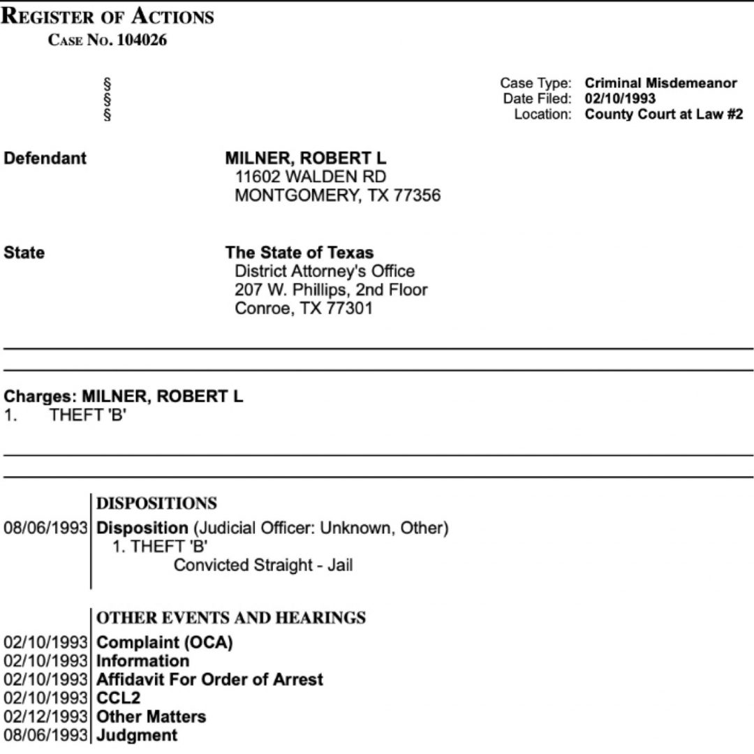 And we still don’t know when Bob moved to The Woodlands the first time! His Facebook page says he moved to The Woodlands in 1990. His new website says he first lived in The Woodlands in 1992. But a Montgomery County Court record shows a misdemeanor theft judgment from 1993 with his address as Walden Road in Montgomery, not The Woodlands.