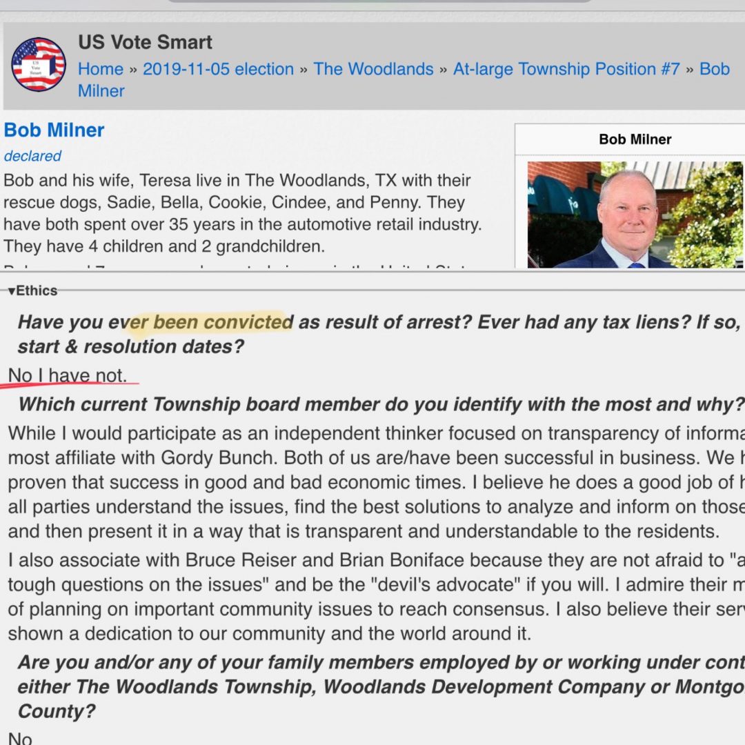 For more information, the Villager article about his false candidate filing that would be the basis for a misdemeanor conviction for lying under oath if done purposefully: https://www.chron.com/neighborhood/woodlands/news/article/Woodlands-board-candidate-lists-inaccurate-14536129.php